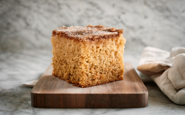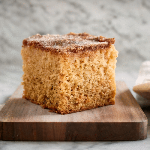 This cake has a dense, moist crumb with flavor from brown butter and concentrated apple cider. It’s finished with a cinnamon-sugar topping that gives it a texture reminiscent of a cake donut.