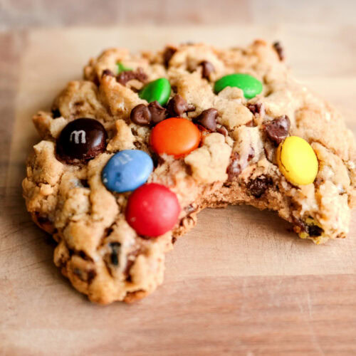 Add the dry ingredients to the wet ingredients and mix on low speed until a dough forms. Fold in the oats, followed by the chocolate chips and M&Ms. Cover the bowl and chill the dough for at least one hour.