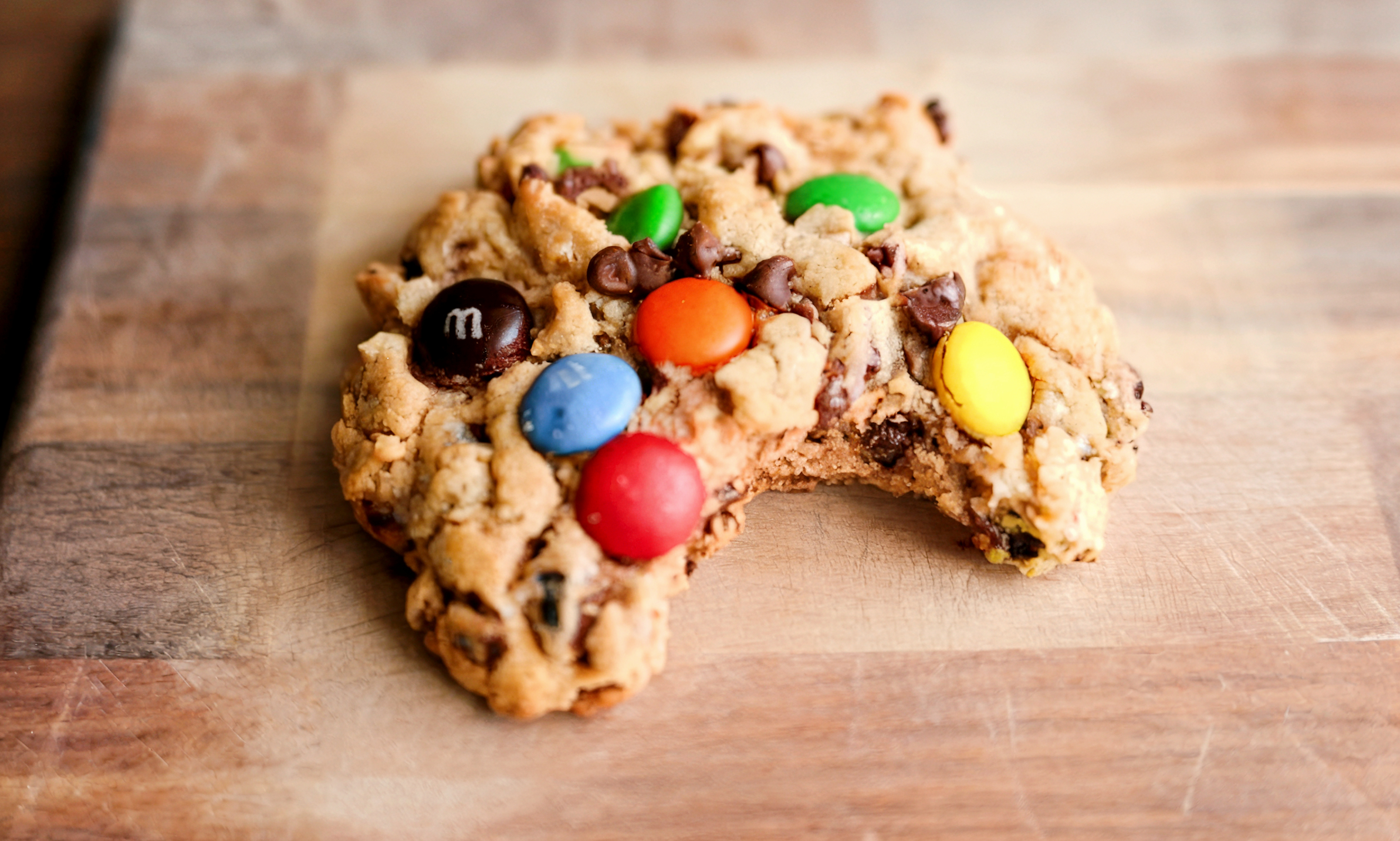 Add the dry ingredients to the wet ingredients and mix on low speed until a dough forms. Fold in the oats, followed by the chocolate chips and M&Ms. Cover the bowl and chill the dough for at least one hour.