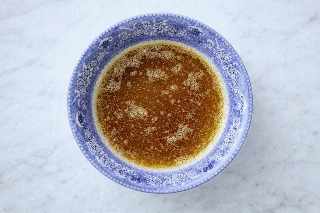 When the sizzling quiets down, you’ll notice golden-brown specks forming on the bottom and it will smell nutty. Immediately pour the butter and all the brown bits into a large bowl and let it cool in the fridge for about 10 minutes.