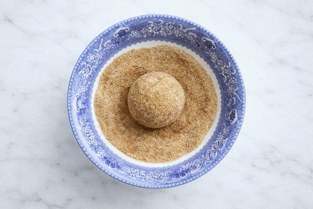 - Roll chilled dough into 2 tablespoon balls, coat in cinnamon sugar mixture.