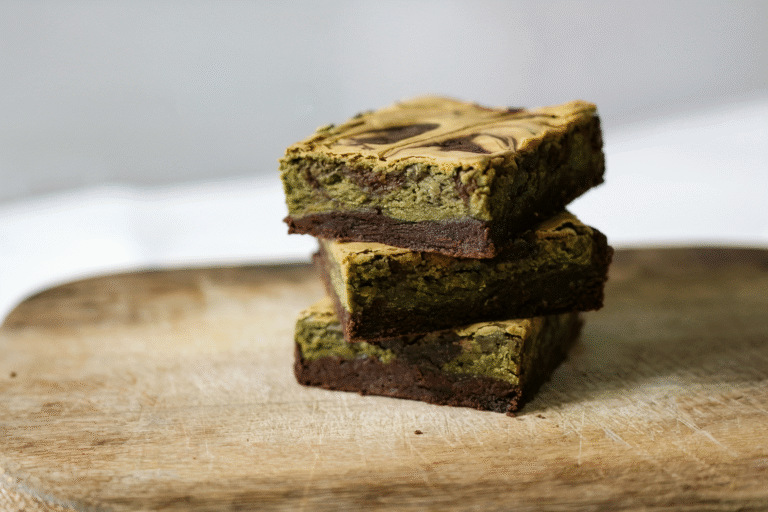 Pour all of the matcha batter over the chocolate layer. Drop spoonfuls of the remaining chocolate batter on top of the matcha.
