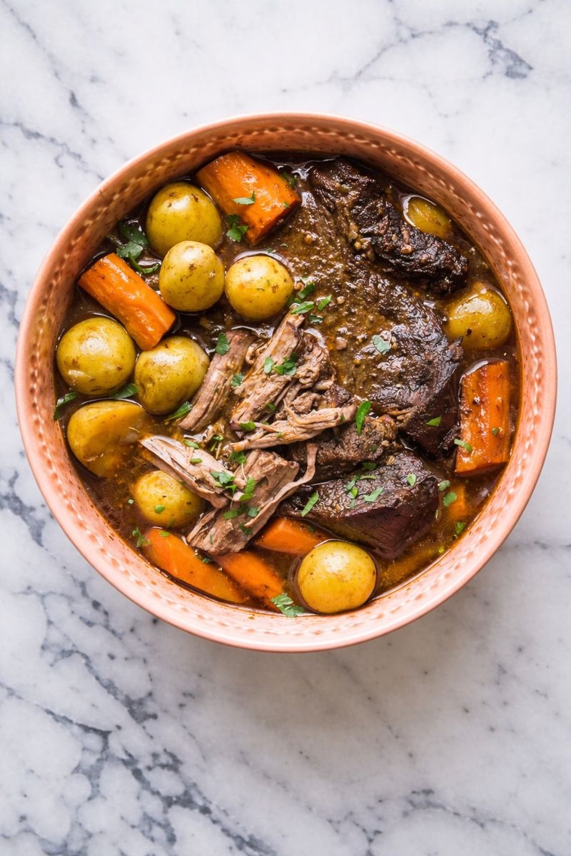 Remove the pot from the oven, add the carrots and potatoes around the roast, and continue cooking until the meat shreds easily with a fork, about ~60 minutes longer.