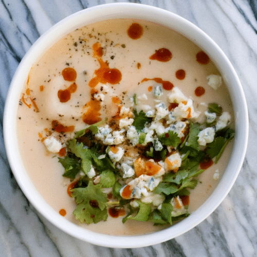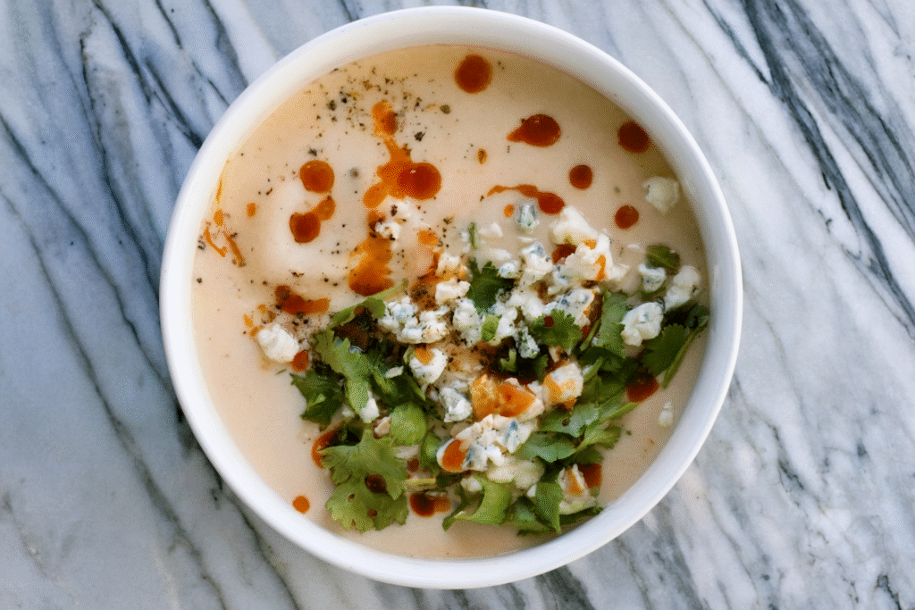 This is a creamy, pureed cauliflower soup with the flavor of buffalo wings. It’s made with a base of sauteed aromatics, cauliflower, and vegetable broth, and finished with cheddar cheese and buffalo sauce.
