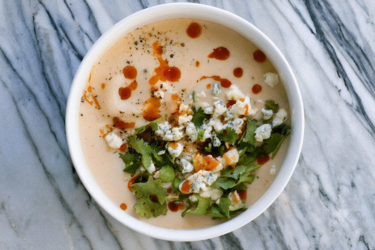 Carefully transfer the cauliflower and cooking liquid to a blender. Secure the lid, and hold a towel over the top while you puree the soup until it’s completely smooth.