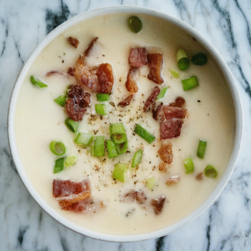 This is a lighter take on potato soup that gets its creaminess from puréed roasted cauliflower. It’s a simple, one-pot soup topped with bacon and green onions.