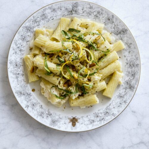 - Divide pasta between bowls and top with toasted pine nuts, julienned basil, extra Parmesan, and black pepper.
