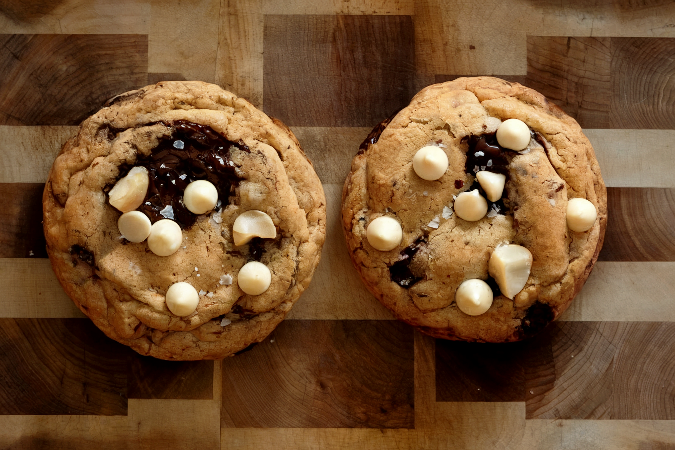 As soon as the cookies come out of the oven, press the remaining 1/2 cup of white chocolate chips into their tops. Let the cookies cool on the baking sheet for 5-10 minutes to set up before transferring them to a wire rack to cool completely.