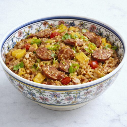 This is a simplified version of jambalaya that lets the slow cooker do most of the work. I cook the rice separately then fold it in at the end so it doesn’t get mushy.