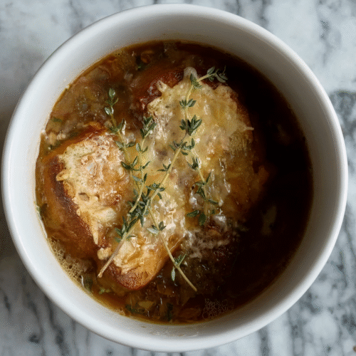 - Ladle soup into ovenproof bowls. Top with toasted bread and cheese.