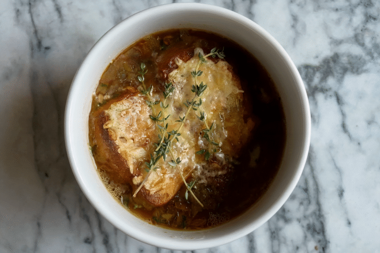 - Ladle soup into ovenproof bowls. Top with toasted bread and cheese.