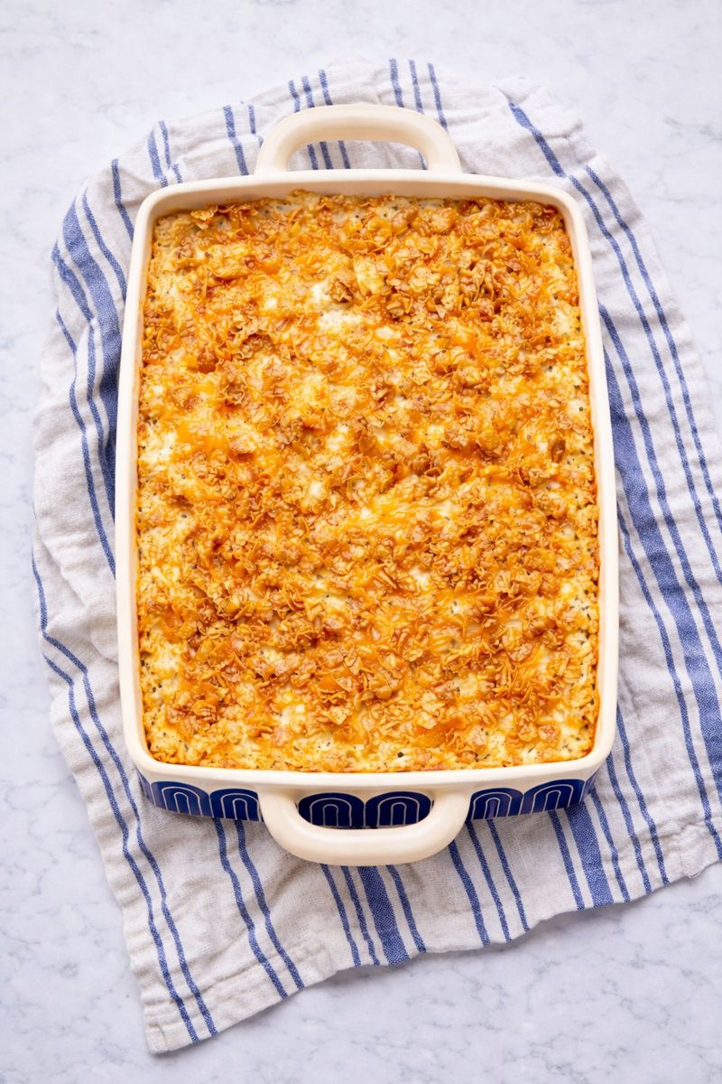 - Combine remaining melted butter with crushed corn flakes and sprinkle over casserole.