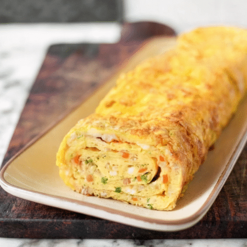 Carefully slide the rolled omelette back to the middle of your pan. Pour another thin layer of the egg mixture to cover the open space, aiming for the edge of the rolled omelette so the new layer sticks to the old one. Allow that layer to fry for 2-3 minutes.