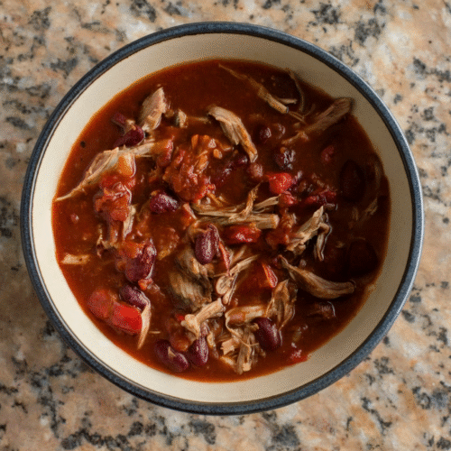 Dump the sautéed vegetable mixture, crushed tomatoes, fire-roasted tomatoes, chicken stock, kidney beans, cumin, and the seared pork (plus any juices from the plate) into the pot.
