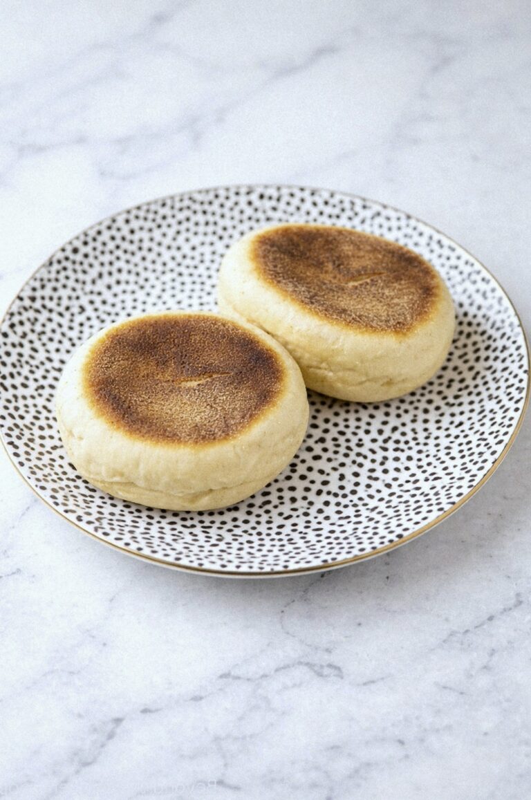 Once cool, split with a fork by poking holes around the perimeter, then tear – instead of using a knife – this gives you those classic nooks and crannies that hold butter and jam.