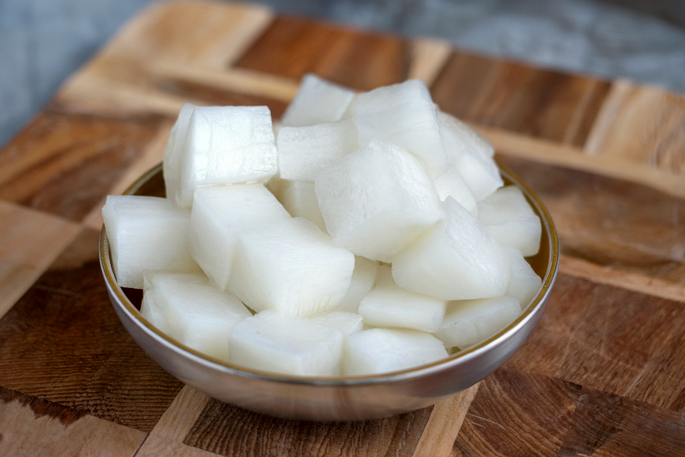 Cut the peeled radish into 3/4-inch thick discs, then cut the discs into uniform 3/4-inch cubes.
