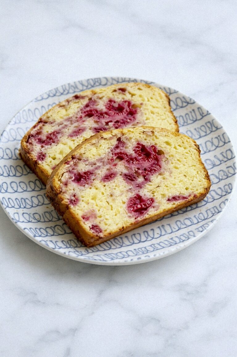 This is a simple quick bread that’s ready in just over an hour and uses fresh raspberries. The lemon brightens everything up and the raspberries add little bursts of tartness throughout each slice.