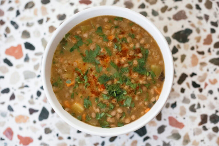 Serve the soup hot, garnished with fresh parsley, a sprinkle of red pepper flakes, and a very important squeeze of fresh lemon juice.