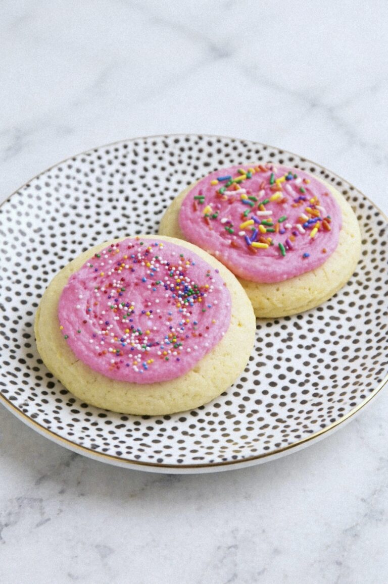 - Spread frosting on cooled cookies and top with sprinkles immediately.