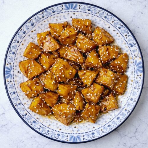 - Toss cubes with 2 Tbsp neutral oil on greased baking sheet and spread in single layer.