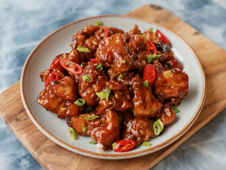 The chicken doesn’t get patted dry because you need moisture for the cornstarch to stick and create that light, crispy coating. Mixing the cornstarch slurry right before adding prevents it from separating and leaving you with lumpy sauce.