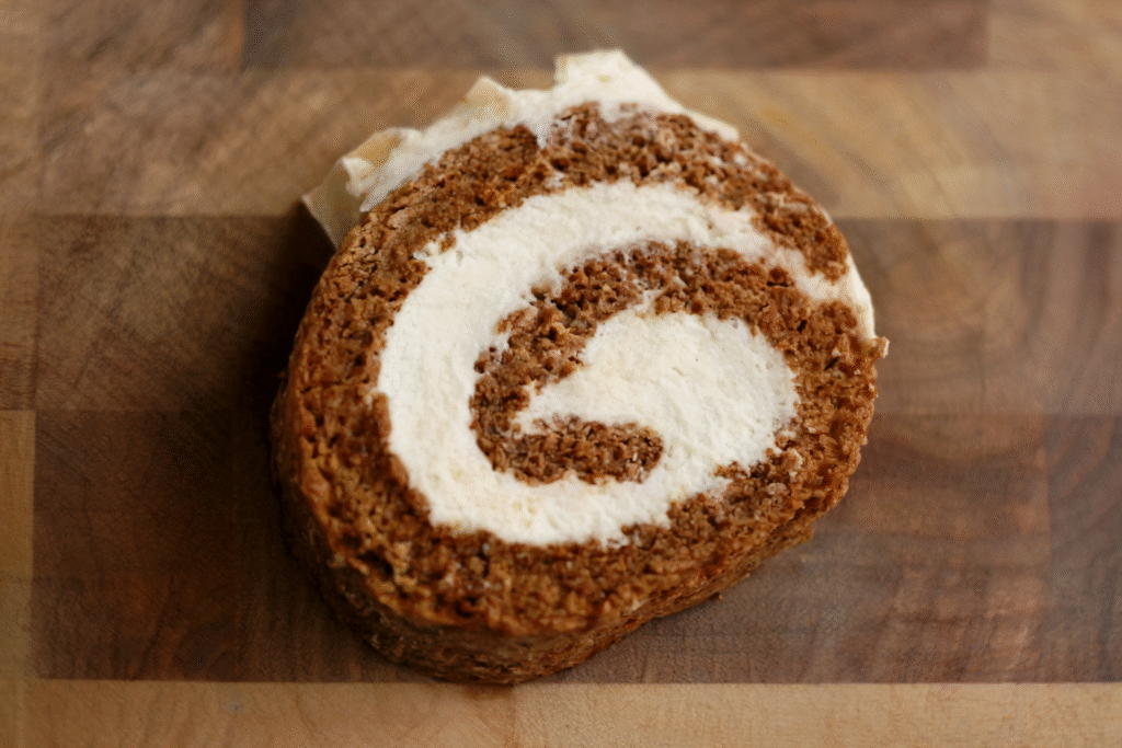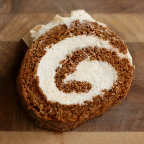Wrap the finished roll in plastic wrap and chill for at least an hour to set the frosting. Before serving, trim the ends with a serrated knife for a clean look and dust with more powdered sugar.