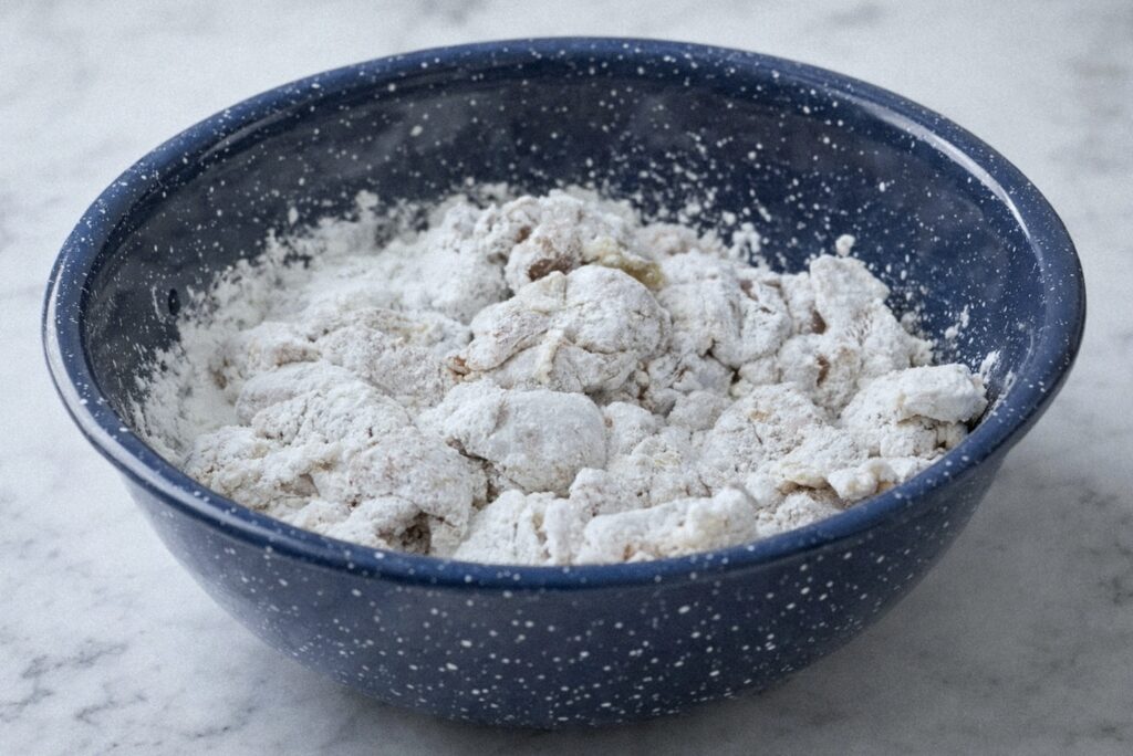 - Add cornstarch and toss until all pieces are fully coated with no bare spots.