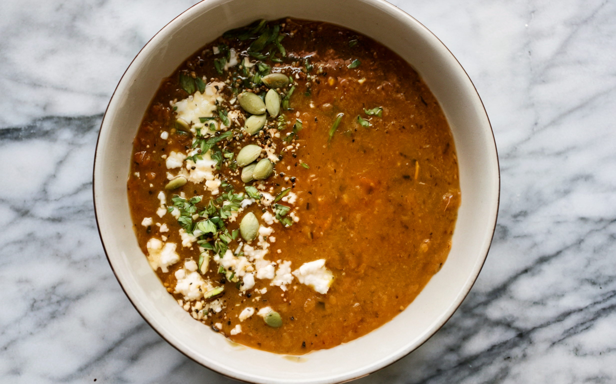 Ladle the soup into bowls and garnish with queso fresco, pepitas, and cilantro.