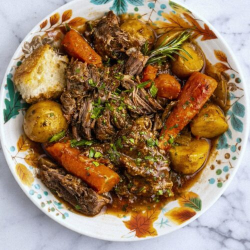 - Place seared roast on top and arrange remaining vegetables and potatoes around it.