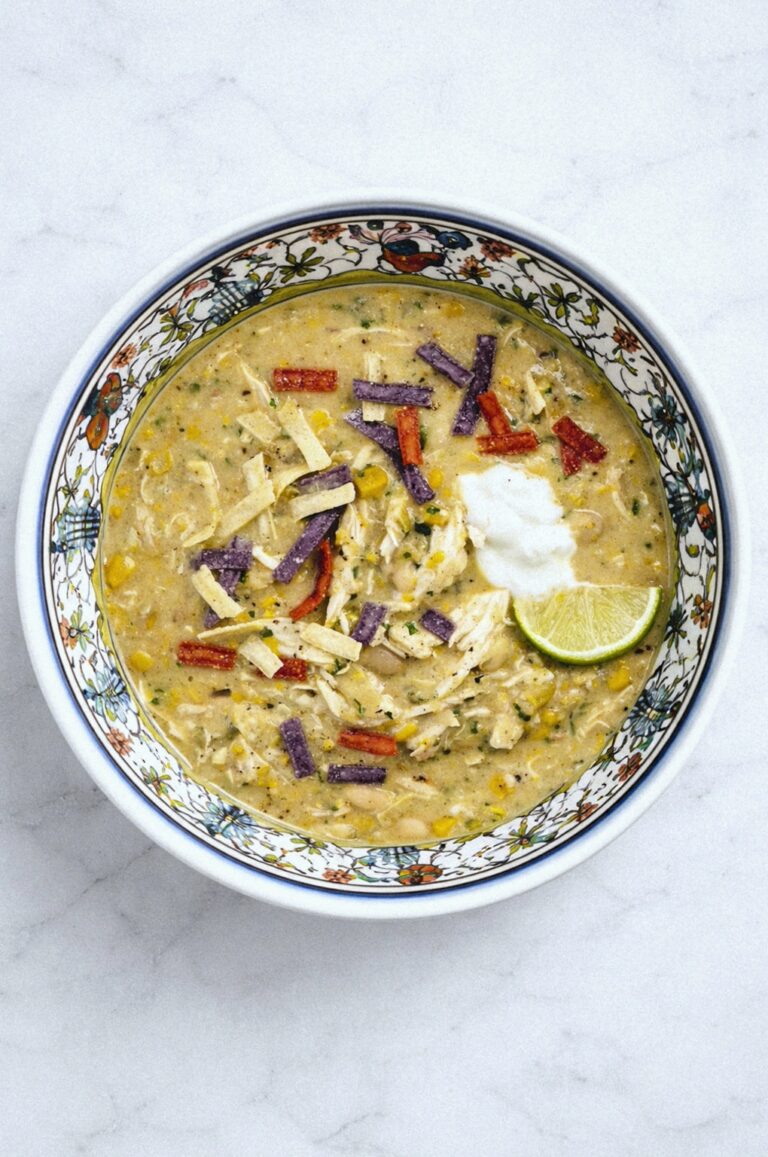Serve topped with crushed tortilla chips, extra sour cream, lime wedges, and hot sauce.