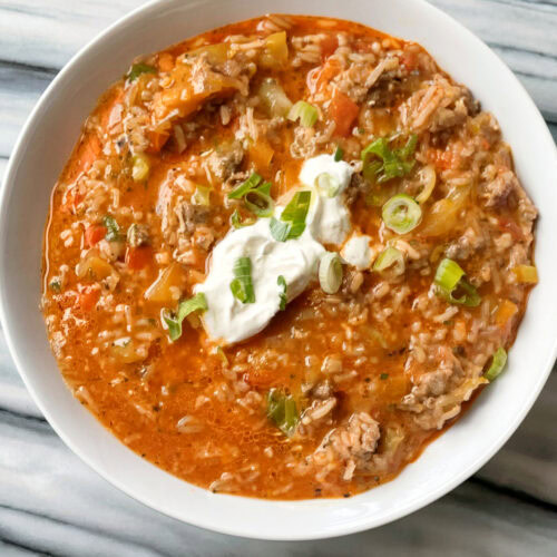- Add rice, crushed tomatoes, and beef broth. Stir to combine.