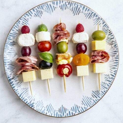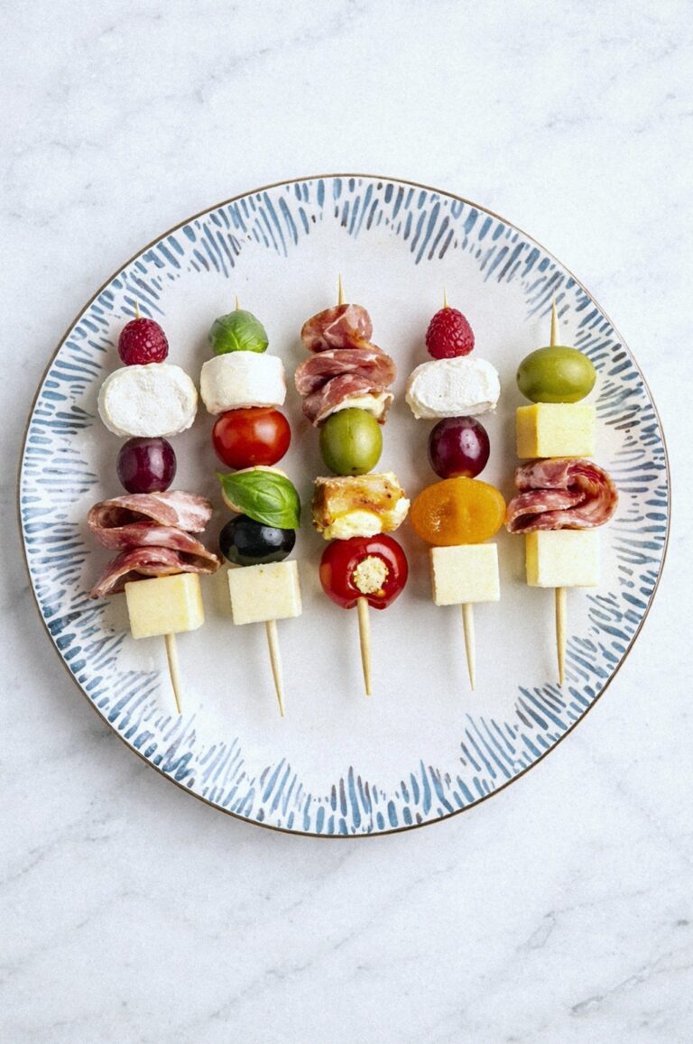- For 9 savory skewers, thread in order: havarti cube, 1 Castelvetrano olive, folded salami, cheddar cube, 1 stuffed cherry pepper, and prosciutto roll.