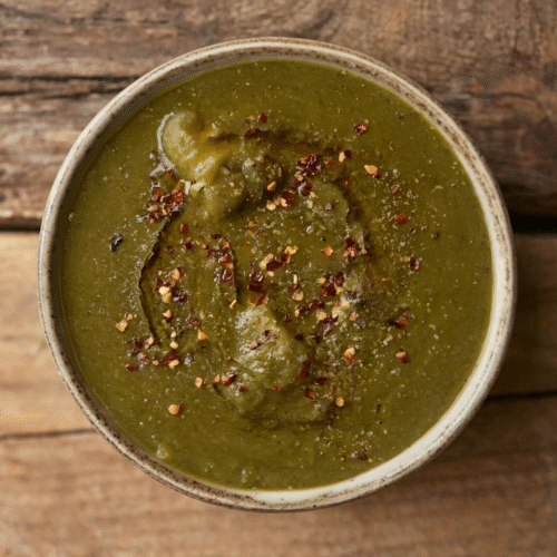 Use an immersion blender to puree the remaining soup in the pot. Blitz it until it is thick, creamy, and pale green.
